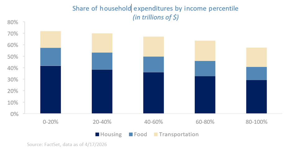 While inflation has moderated significantly from its peak in 2022, it remains above the Federal Reserve’s long-term target of 2%, and it impacts households differently. Lower-income households allocate a larger share of their income to non-discretionary expenses such as rent, food and energy, categories that have experienced persistent price pressures. Higher-income households, by contrast, tend to have greater financial flexibility and are less impacted these essential cost increases as a share of income. This dynamic reinforces the divergence in financial experiences across income groups.